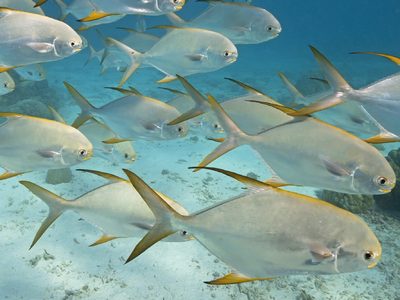 Для информации - пермит или круглый пампано (Trachinotus falcatus) — рыба из семейства ставридовых отряда окунеобразных. Обитает в западной части Атлантики в тропических водах на глубинах до 30 м. Темная спина и плавники, серебристые бока, желто-оранжевый участок брюха перед анальным плавником. Взрослые пермиты питаются крабами, креветками, мелкой рыбой. Достигает 122 см длины и веса 36 кг.