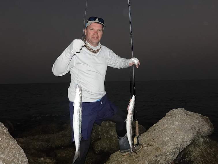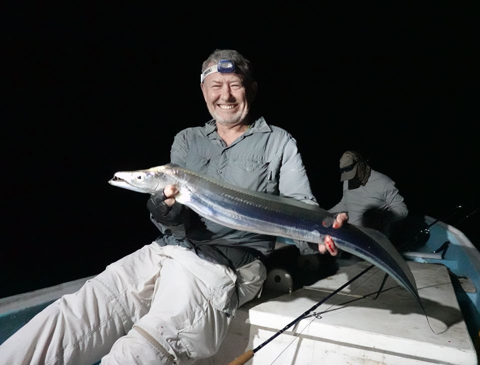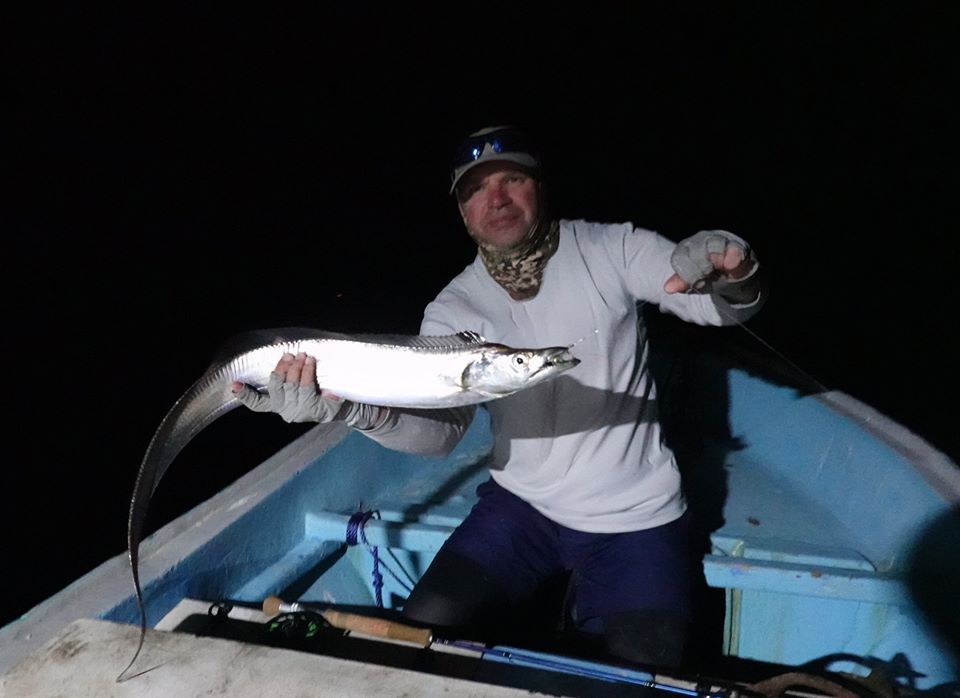 Цель нашей рыбалки - это рыба под названием оманский меч. Размером где то с метр длинной и серебристого цвета с очень острыми зубами, способные перекусить спокойно поводок толщиной 0,5 мм. Ставили тонкий стальной поводок и она его так же умудрялась перекусывать. Ловиться она в темное время суток на донную снасть на которую насаживали кусочки сардины. Рыбалка на это чудо рыбу очень увлекательная и интересная, можно сказать уникальная. Когда идет ход этой рыбы оманские рыбаки массового выходят в море, такое ощущение, что началась морская путина.